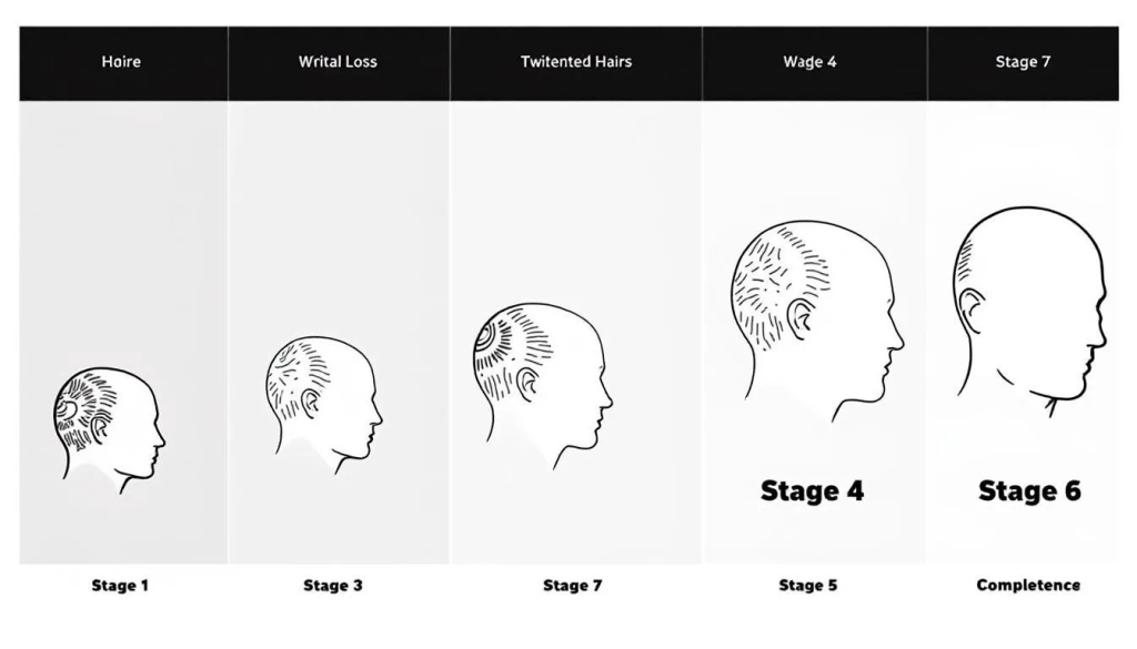 - Hair loss follows the Hamilton-Norwood classification with seven distinct stages, starting with temple recession and vertex thinning