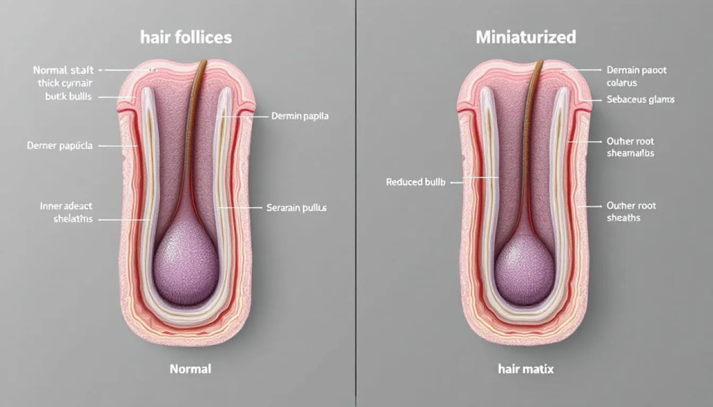 The hair matrix, where active cell division produces the hair shaft, also undergoes significant changes during miniaturization. Cell proliferation rates decrease, leading to the production of finer, shorter hairs with reduced pigmentation. Eventually, the matrix may become so compromised that it can only produce fine vellus hairs similar to those found on other body areas.